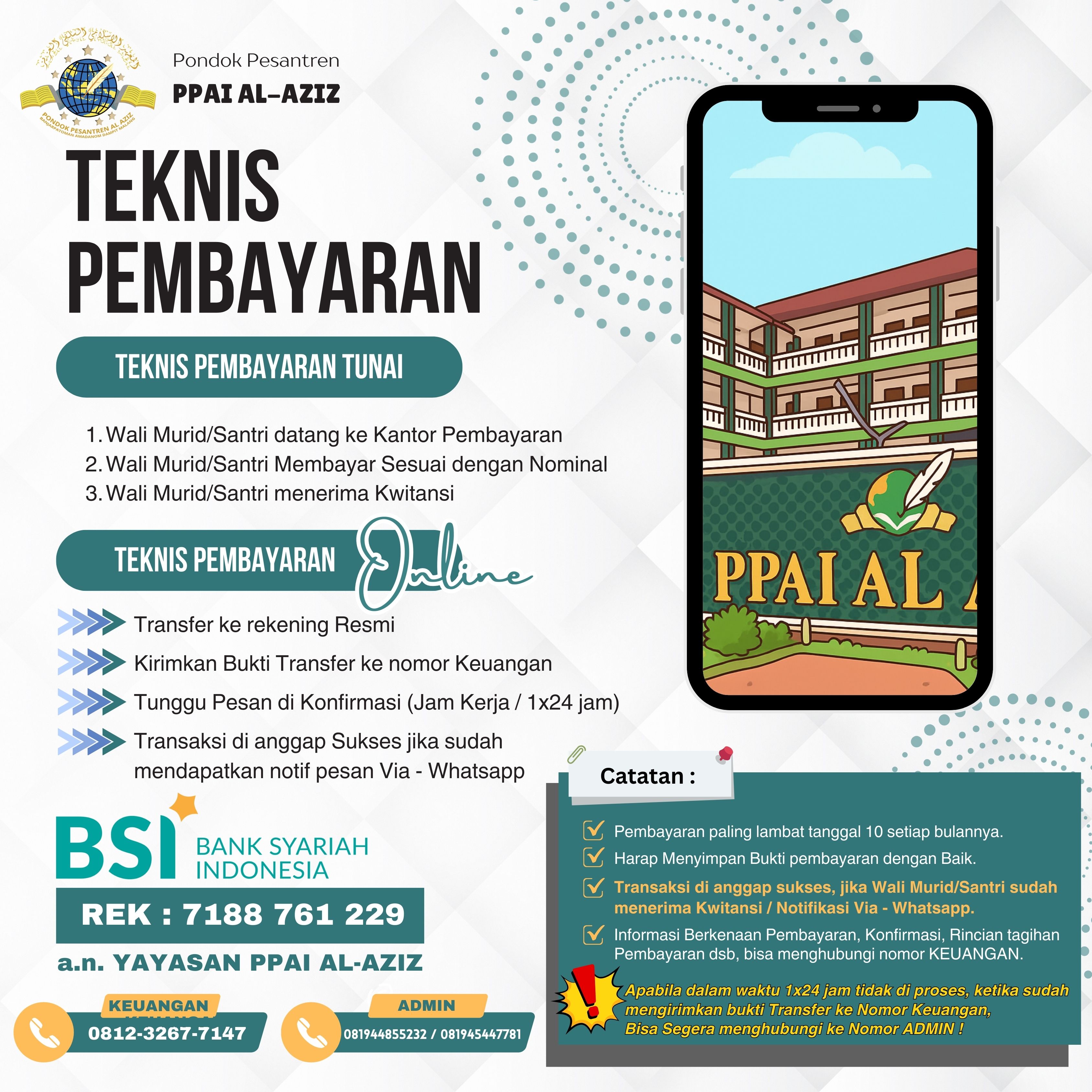 SPMB (SISTEM PENERIMAAN MURID BARU) Online, Pergantian Istilah dari PPDB di tahun sebelumnya merupakan sistem yang diciptakan untuk otomatisasi pendaftaran yang biasanya dilaksanakan secara manual. Dengan adanya sistem ini maka calon siswa/santri yang akan mendaftar ke PPAI AL-Aziz ini diberi kemudahan untuk mendaftarkan diri. Informasi mengenai masuk santri ke pondok akan di informasikan di kemudian hari